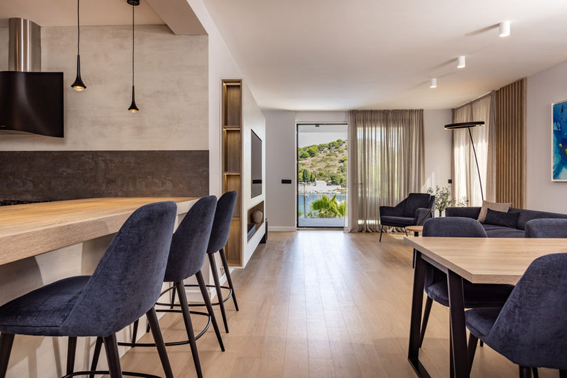The project only needed small corrections regarding the interior in certain zones, all in agreement with the investor. The same combination of materials was chosen on all levels for custom-made furniture, and the same materials were also used for installation (indoor and outdoor ceramics, cladding, etc.).